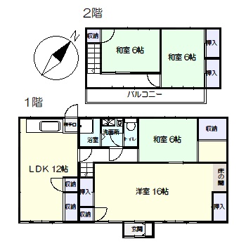 2階建て貸家、バストイレ別、プロパンガス給湯、洋室、和室、収納、ベランダ、インターホン、化粧洗面台、室内洗濯機置場、駐車場2台、シューズボックス、更新料無し